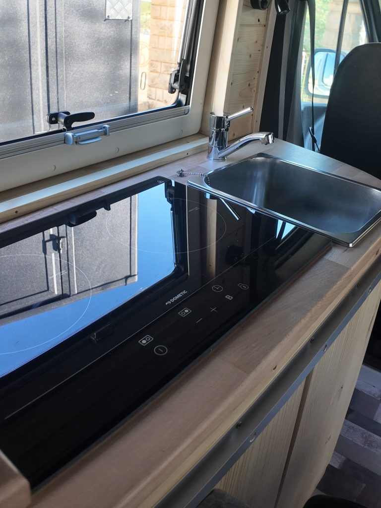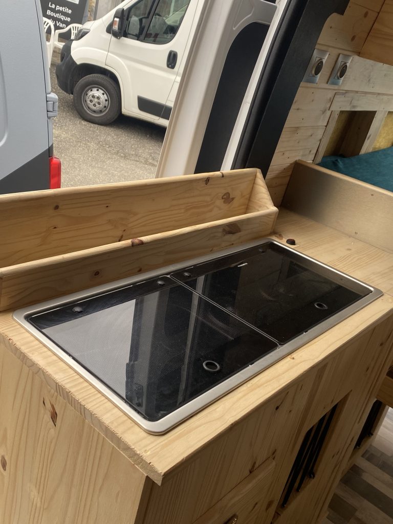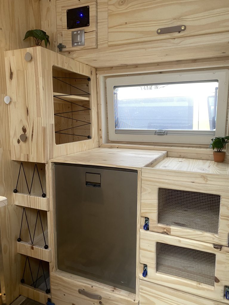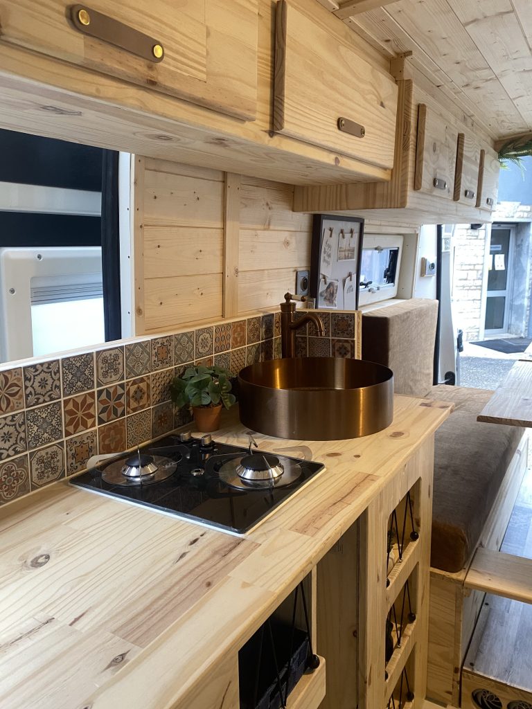 Ce trafic a été aménagé spécialement pour leur chien : la cuisine a été modifiée pour pouvoir installer le panier de leur toutou !