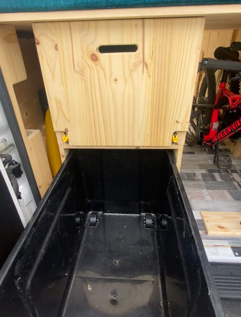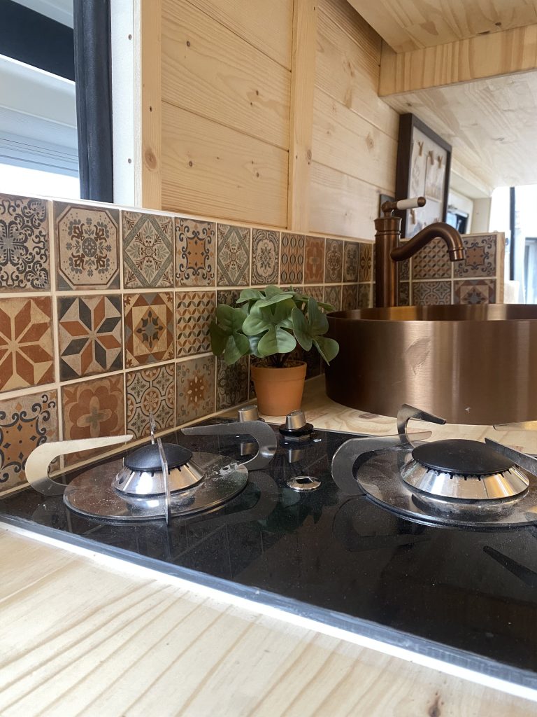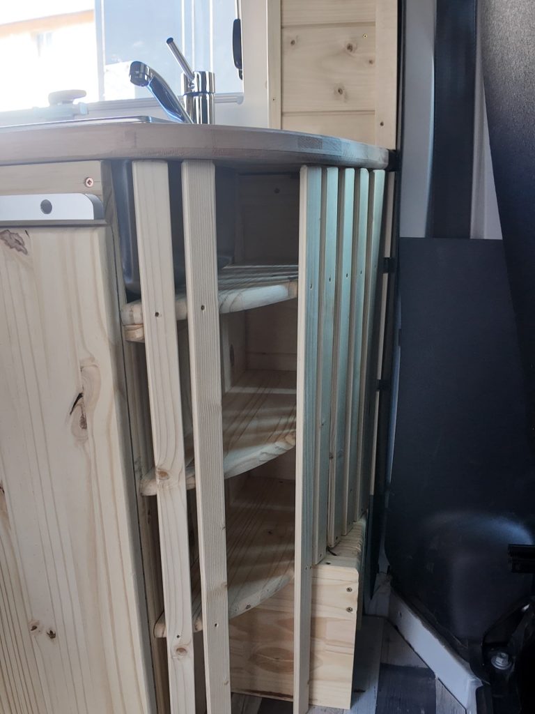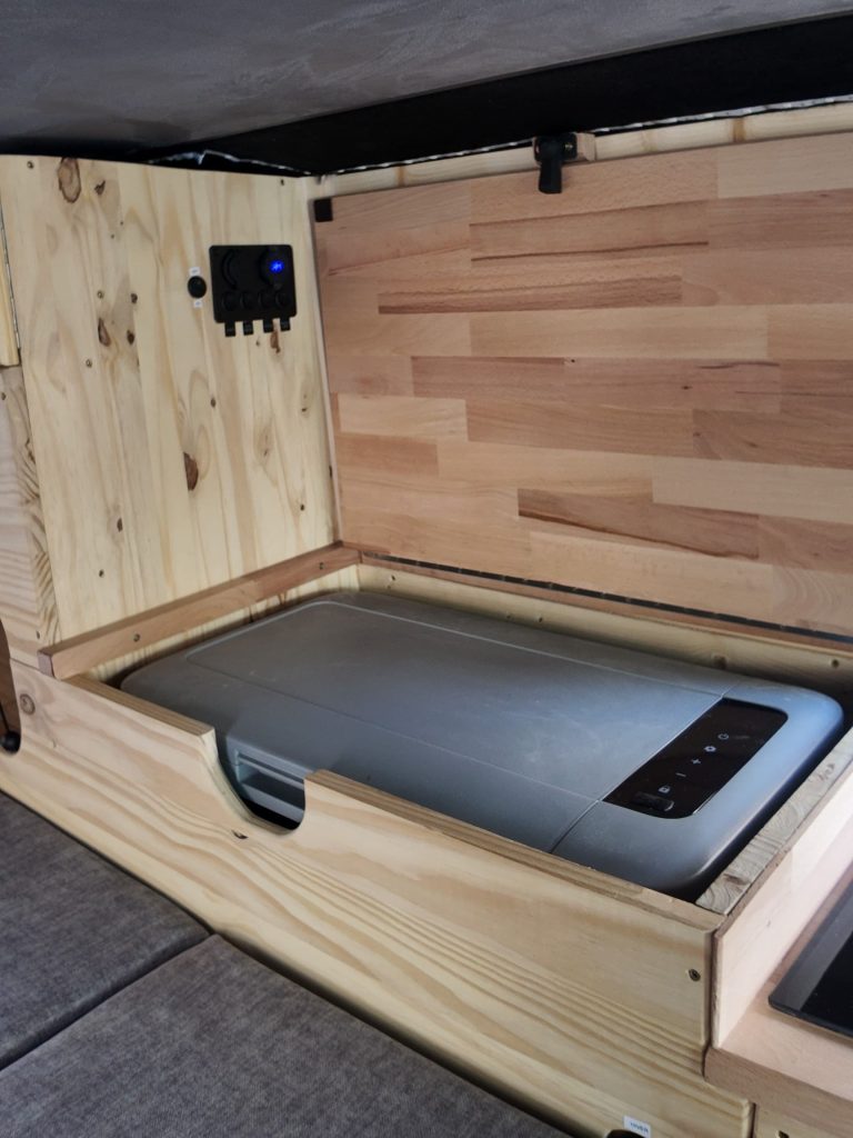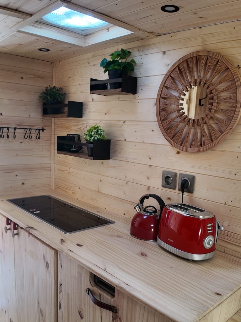 Ce trafic a été aménagé spécialement pour leur chien : la cuisine a été modifiée pour pouvoir installer le panier de leur toutou !
