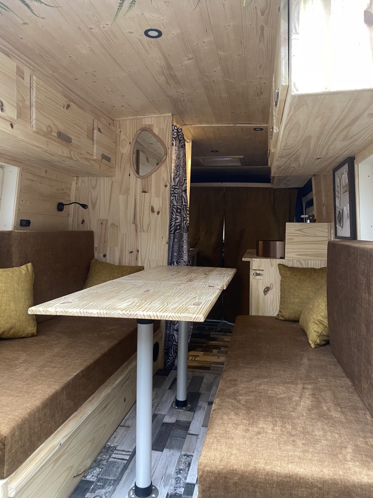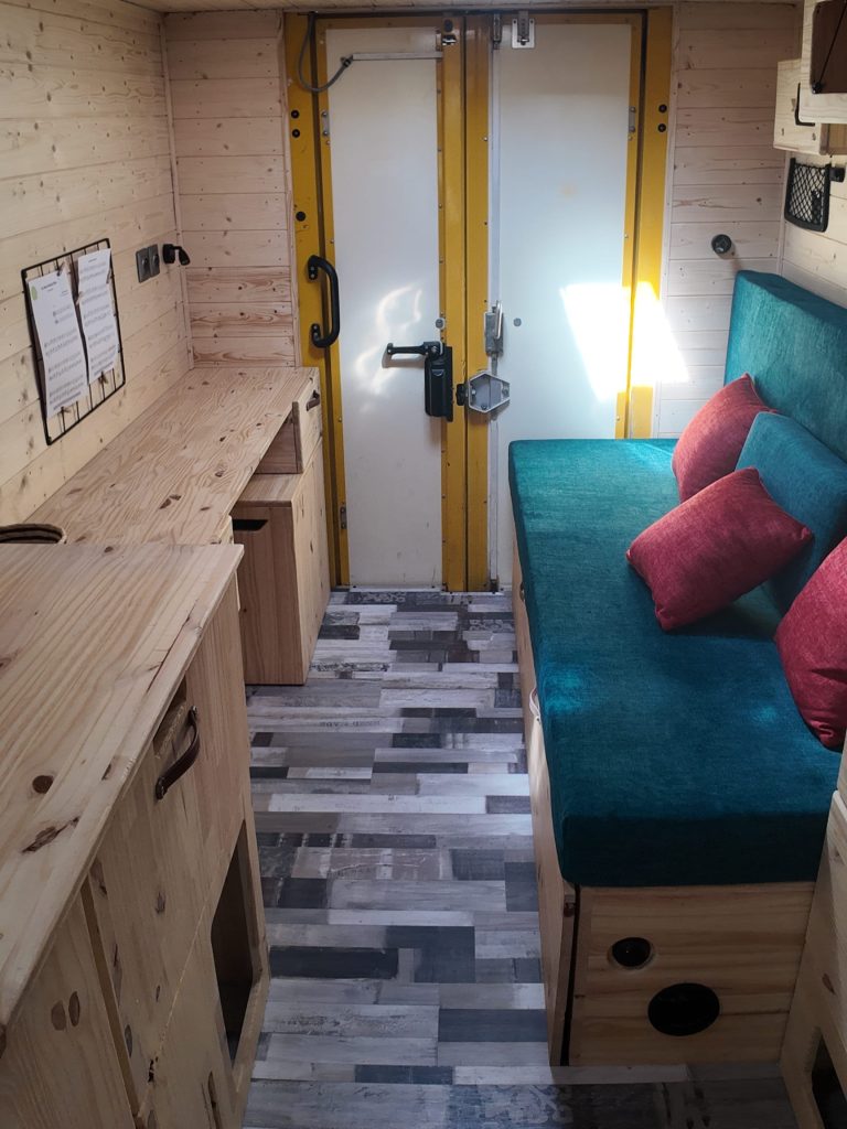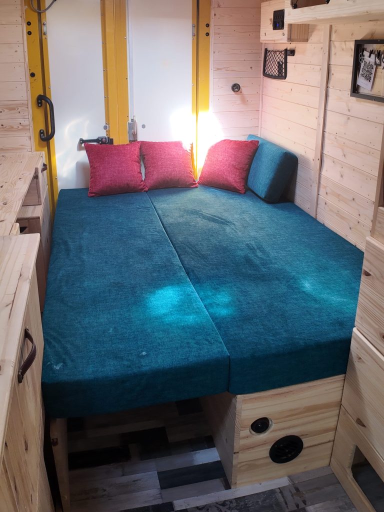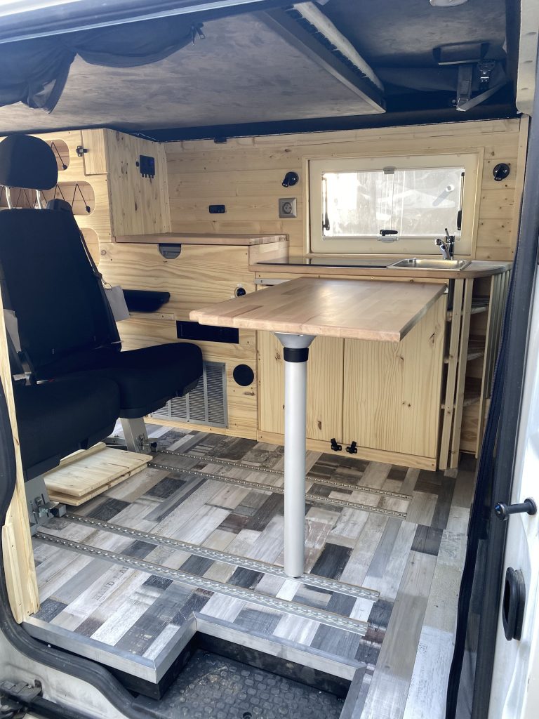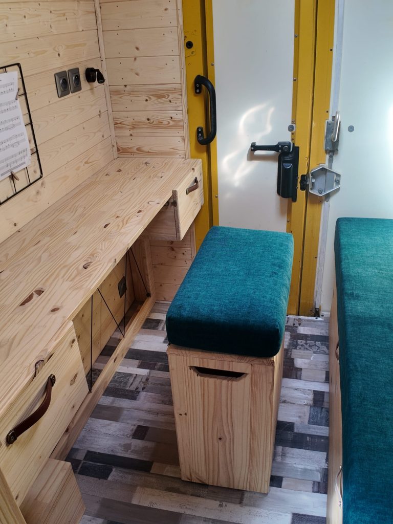 Nous lui avons également rajouté 2 sièges sur rails qui s’avancent et se plient pour pouvoir mettre en place le lit double.