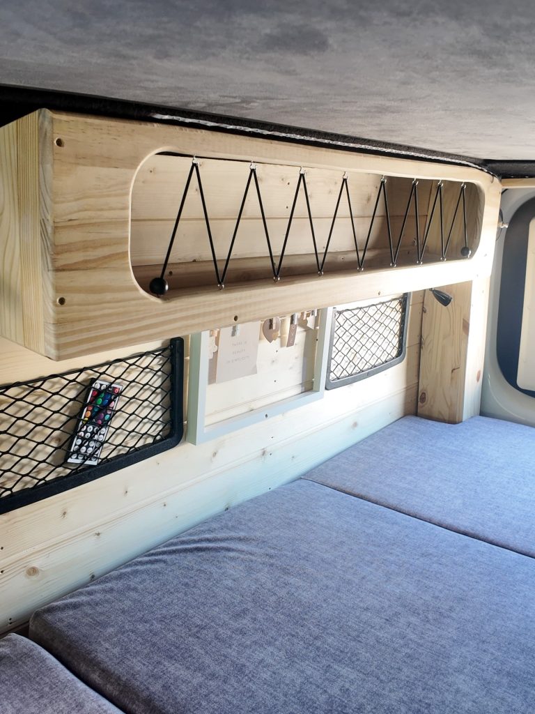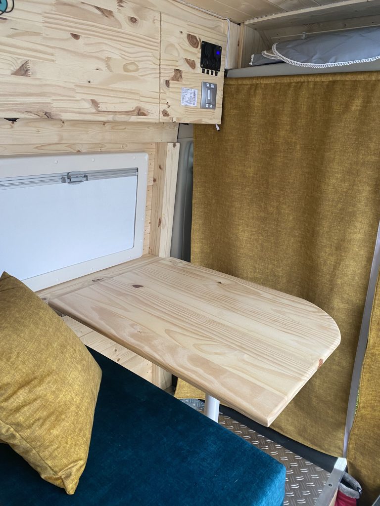 Équipé d’un toit relevable, nous pouvons être debout dedans tout en gardant une petite hauteur pour la route. Ce toit permet d’ajouter 2 couchages en plus !