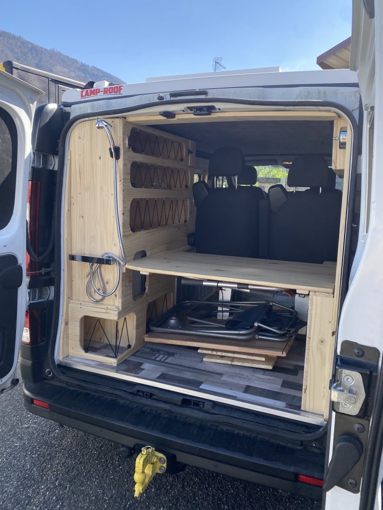 Une des planches du lit fait également office de table d’extérieur avec 2 petites chaises de camping ramenées par notre client.